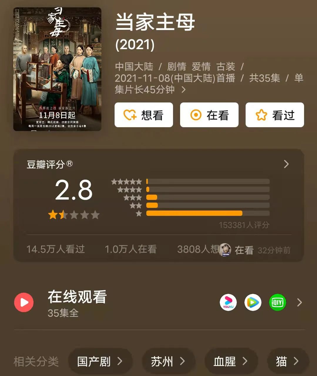 前段時(shí)間,《當(dāng)家主母》陷入疑似“虐貓”的爭(zhēng)議中,但劇組并沒(méi)有及時(shí)給到拍攝時(shí)的花絮素材,等到爭(zhēng)議愈演愈烈之后發(fā)出了白貓與主人的視頻,并送上了“一紙聲明”。遲到的聲明以及尚不足以驗(yàn)證是同一只白貓的證明,瞬間點(diǎn)燃了諸多愛(ài)貓人士的怒火,紛紛涌入豆瓣打一星,截至當(dāng)前,《當(dāng)家主母》評(píng)分已從開(kāi)分的5.2降至2.8,一星占比高達(dá)78.5%,“貓”、“血腥”成了這部劇的關(guān)聯(lián)詞。