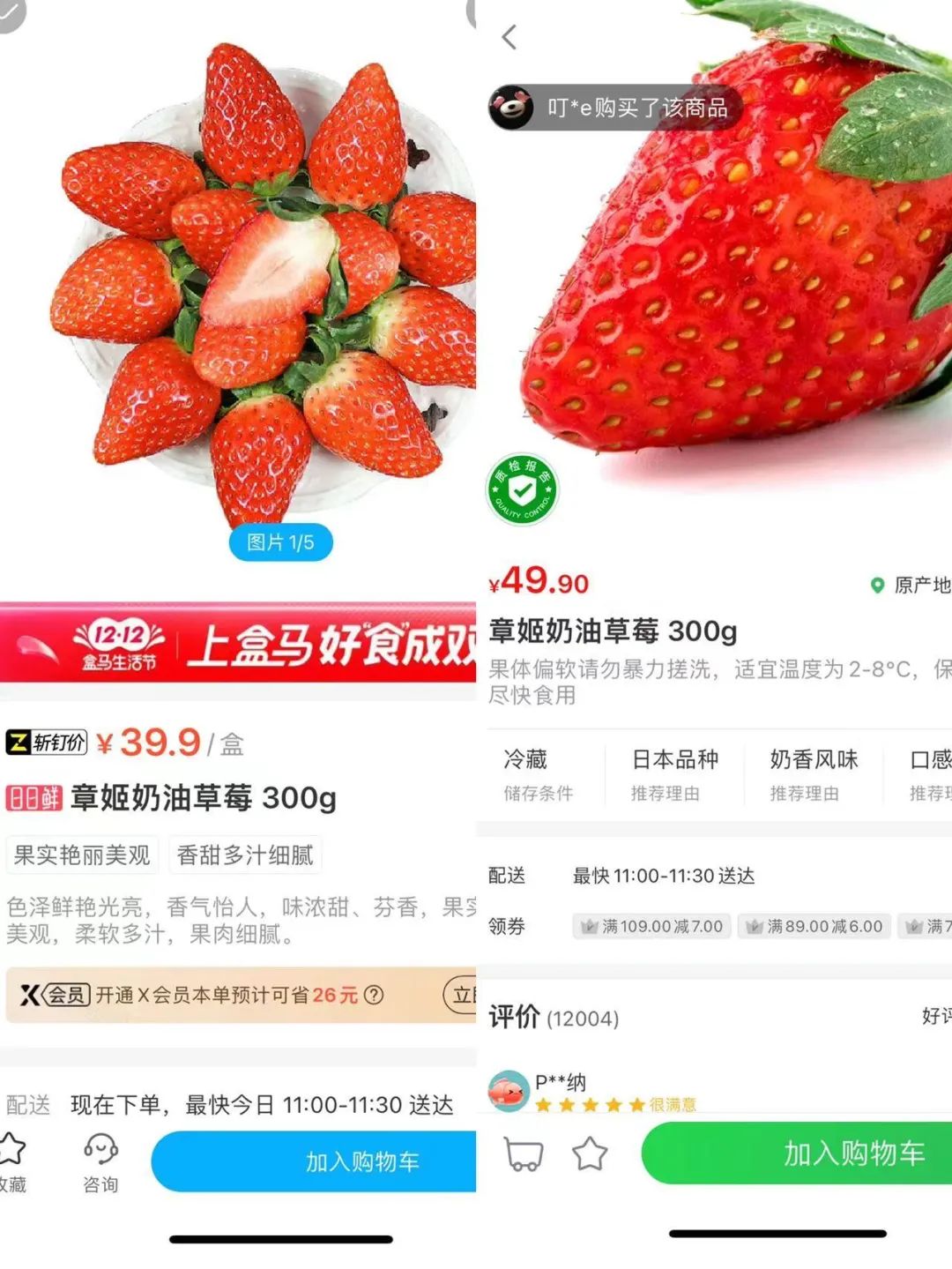 以300g的奶油草莓為例,盒馬斬釘價(jià)39.9元/盒,而叮咚買菜費(fèi)用在49元/盒。