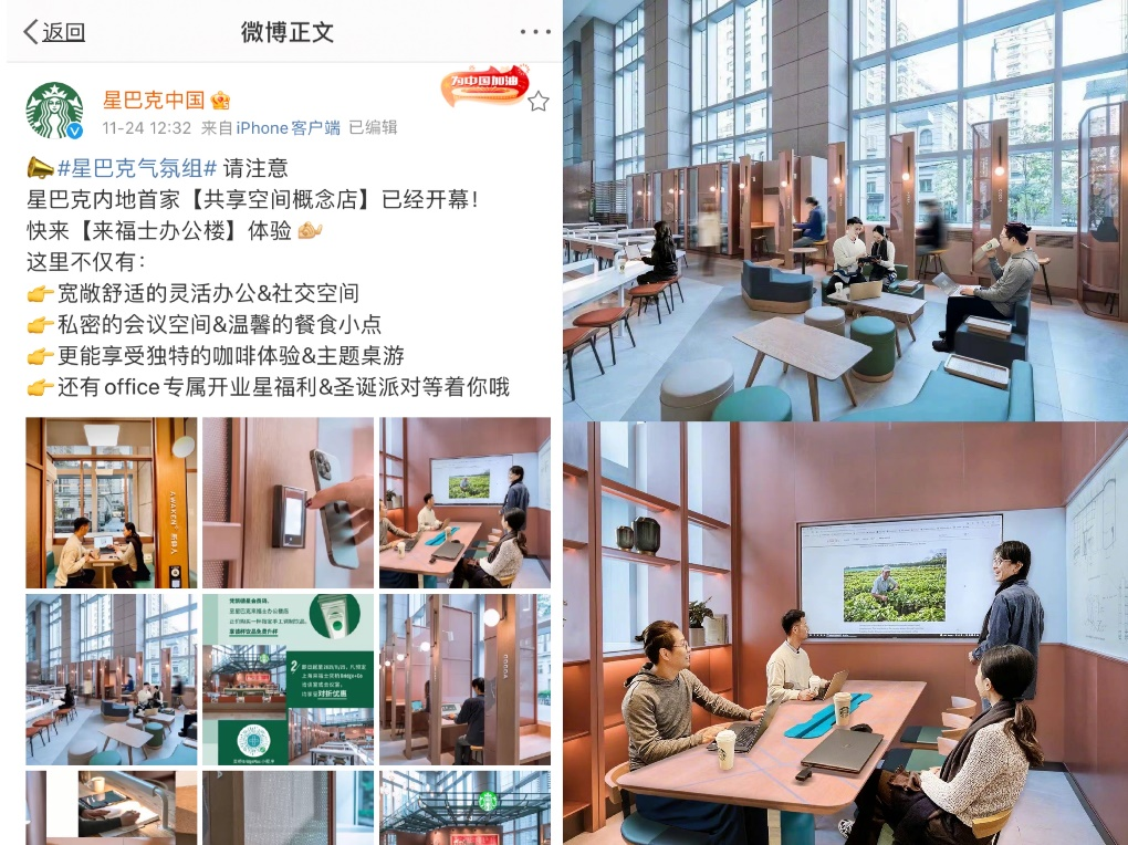 在其共享空間概念店開業(yè)后,“星巴克中國”官方微博還發(fā)布微博,“星巴克氣氛組請(qǐng)注意,星巴克內(nèi)地售價(jià)共享空間概念店已經(jīng)開幕,快來來福士辦公樓體驗(yàn)!”