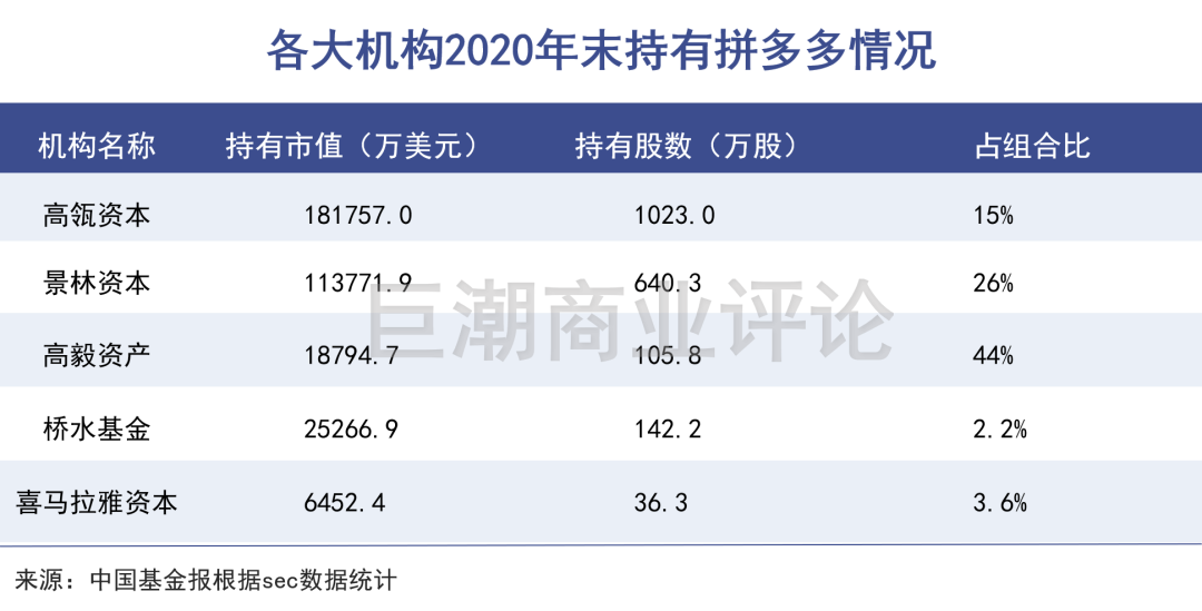 除了高瓴資本、景林、喜馬拉雅們之外,曾經(jīng)重倉拼多多的還有一批大名鼎鼎的名字: