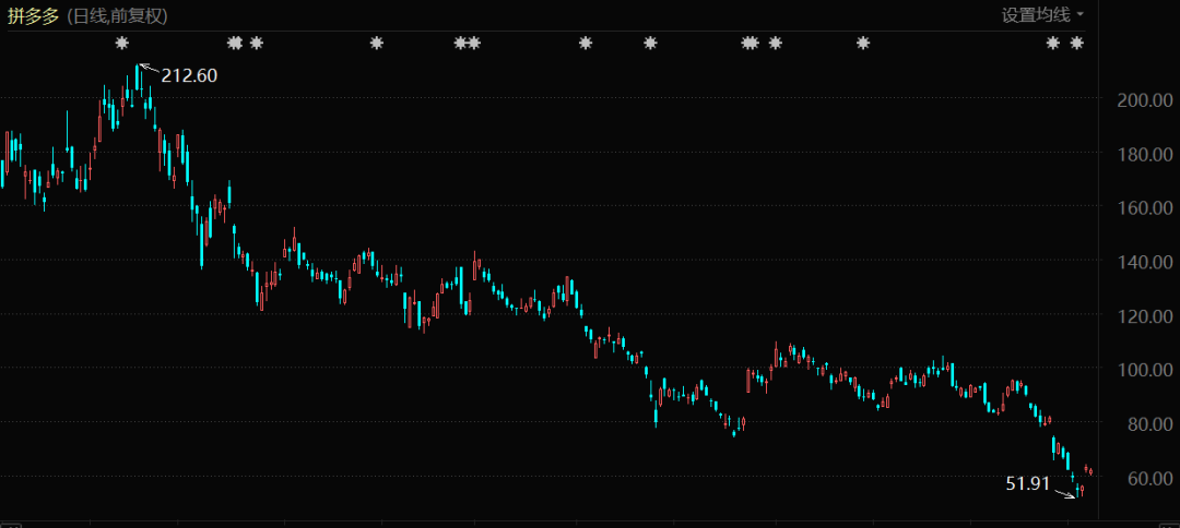 但拼多多市值想要回到2021年2月之前的最高峰——每股212.6美元、3000億美元市值,仍有非常大的難度。從最高點算起,拼多多股價累計跌幅超過了73%。