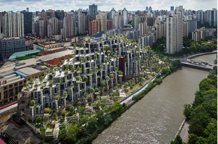 上海蘇州河畔的天安·千樹,好似做綿延大山的一幢滿是綠色的建筑,猶如傳說中巴比倫空中花園,在車水馬龍的鬧市中脫穎而出,簡直就是世外桃源。