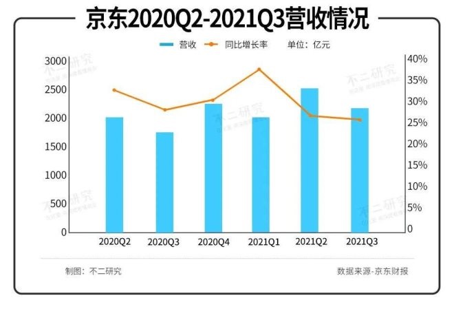 據(jù)京東三季報數(shù)據(jù)顯示,其今年第三季度實現(xiàn)總營收2187.08億元,同比增長25.54%。2021年Q1和Q2營收則分別為2031.76億元,2538.00億元,分別同比增長38.97%和26.23%。