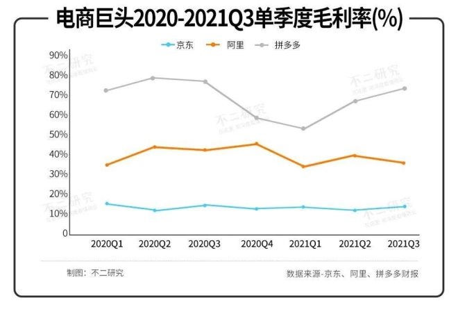 因此,京東的利潤率遠低于阿里和拼多多,據(jù)三季報顯示,京東、阿里、拼多多2021年第三季度的毛利率分別為14.22%,35.35%,69.50%。