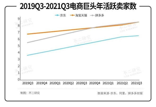 若從年活躍買家絕對數(shù)量角度看,京東已經(jīng)被阿里和拼多多拋之腦后。據(jù)財報顯示,截至2021年Q3,阿里、拼多多、京東年活躍買家數(shù)分別為8.63億、8.67億、5.52億。
