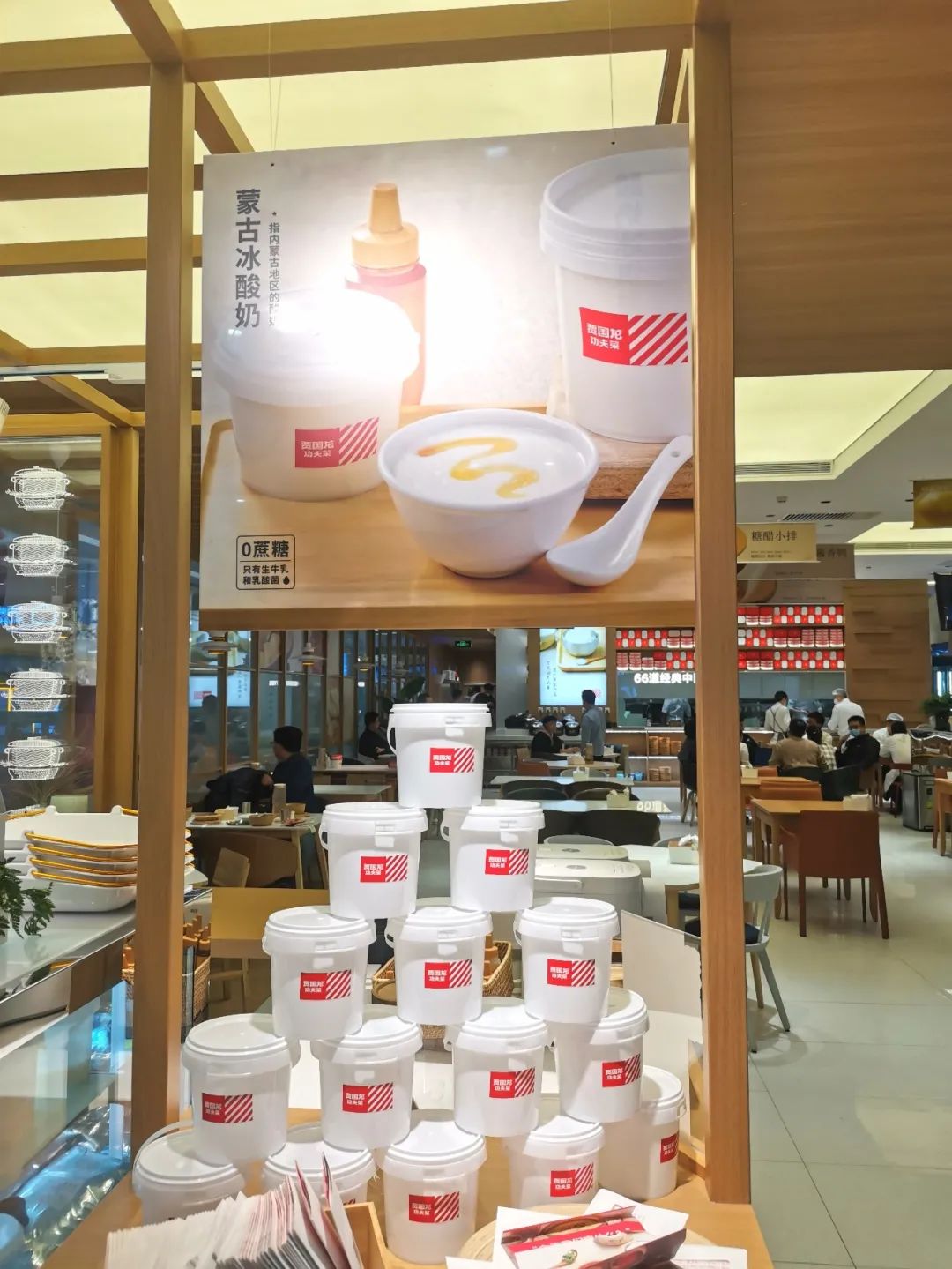 其中的蒙古冰酸奶都是用的桶裝,有大份和小份,疊起來擺在門店入口處格外顯眼。