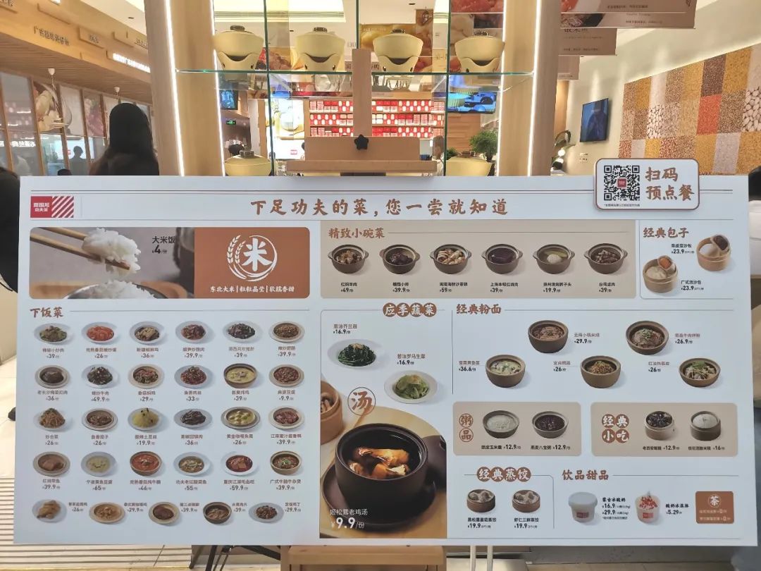 店門口立著一張巨幅菜單,上面標示著餐廳各類菜品和價格,其中9.9元/份的姬松茸老雞湯還特別放大呈現(xiàn),非常醒目,給人一種性價比很高的感覺。