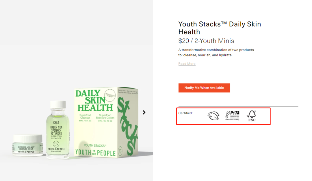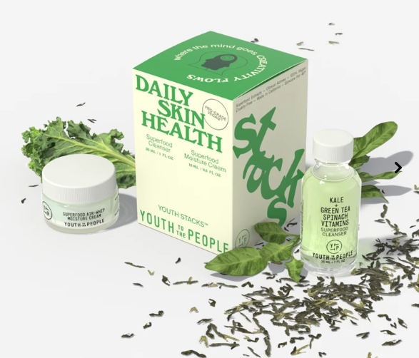 以產(chǎn)品Youth Stacks? Daily Skin Health為例,該產(chǎn)品使用的原料為擁有專利的超級食物混合:羽衣甘藍(lán),菠菜,綠茶,苜蓿,維生素C和E。產(chǎn)品介紹稱:“原料的變革性結(jié)合使其具有清潔、滋養(yǎng)和保濕的功效,富含抗氧化劑的超級食物和適應(yīng)性成分的臨床活性成分,滋潤和舒緩皮膚。富含維生素C、E的洗面奶和保濕霜,能夠為皮膚提供每日劑量的植物性抗氧化劑和營養(yǎng)物質(zhì),幫助對抗自由基損傷,保持肌膚平衡。”