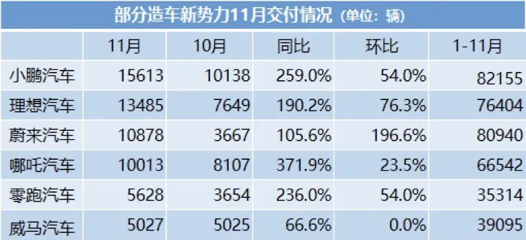 小鵬汽車交付量達(dá)15613臺(tái),同比增長270%;理想汽車也首次破萬,交付13485臺(tái),同比增長190.24%;蔚來汽車交付10878輛,同比增長105.6%。就連第二梯隊(duì)的哪吒汽車銷量也達(dá)到10013輛。