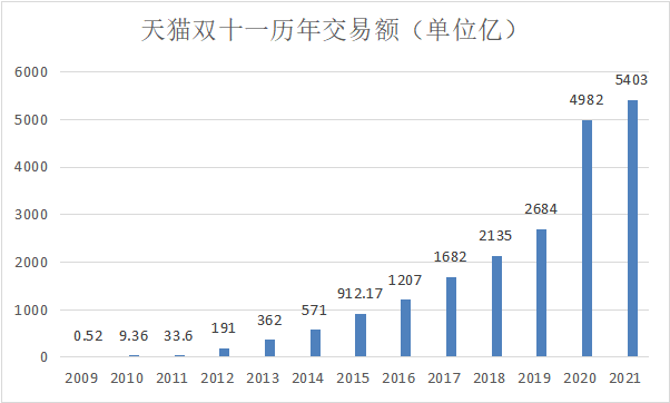 自2009年,天貓雙十一業(yè)績(jī)一路高歌。2009-2013年電商蓬勃發(fā)展、保持幾何級(jí)增長(zhǎng);2014-2019年成交額持續(xù)增長(zhǎng),但增長(zhǎng)勢(shì)頭放緩;在疫情的2020年,因線下受限,反到推動(dòng)線上銷(xiāo)售增長(zhǎng),逆勢(shì)增長(zhǎng)85.6%;2021年觸摸天花板,雖說(shuō)較2020年有8%增長(zhǎng),但是考慮到時(shí)間跨度,成交額應(yīng)該是下降的。
