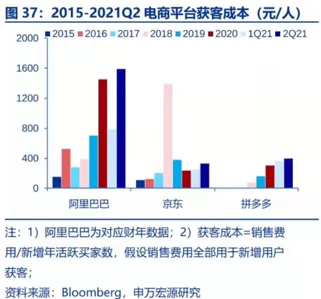 電商平臺(tái)上,線上獲客成本節(jié)節(jié)攀升,甚至高于線下。下圖為各大平臺(tái)往年獲客成本,阿里巴巴最高,到今年獲客成本達(dá)到1600元/人。