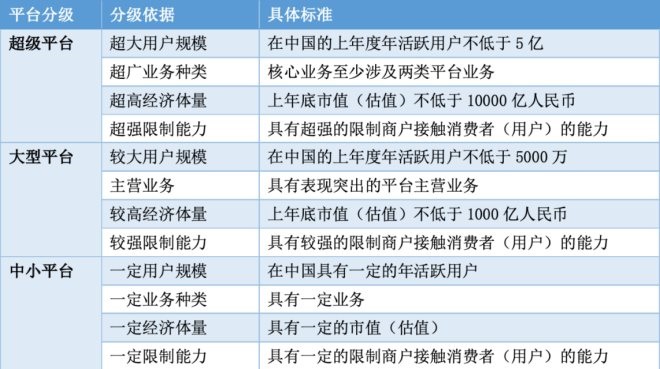 根據(jù)市場(chǎng)監(jiān)管總局發(fā)布《分類(lèi)分級(jí)指南》,把互聯(lián)網(wǎng)平臺(tái)分為超級(jí)平臺(tái)、大型平臺(tái)、中小平臺(tái)三個(gè)級(jí)別。其中,超級(jí)平臺(tái)在中國(guó)的上年度年活躍用戶不低于5億;核心業(yè)務(wù)至少涉及兩類(lèi)平臺(tái)業(yè)務(wù);上年底市值(估值)不低于10000億元;平臺(tái)具有超強(qiáng)的限制商戶接觸消費(fèi)者(用戶)的能力。據(jù)此條件,阿里巴巴、騰訊、美團(tuán)等互聯(lián)網(wǎng)企業(yè),市值均超10000億元,有可能被歸為超級(jí)平臺(tái)。而京東、拼多多等企業(yè)市值也接近10000億元。