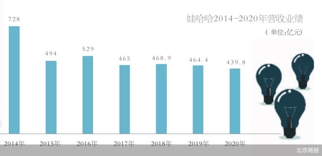 數(shù)據(jù)顯示,2013年,娃哈哈營(yíng)收達(dá)到783億元,隨后開始走下坡路。2014-2018年,娃哈哈的營(yíng)收分別為728億元、494億元、529億元、465億元、468.9億元,四年間縮水近300億元。