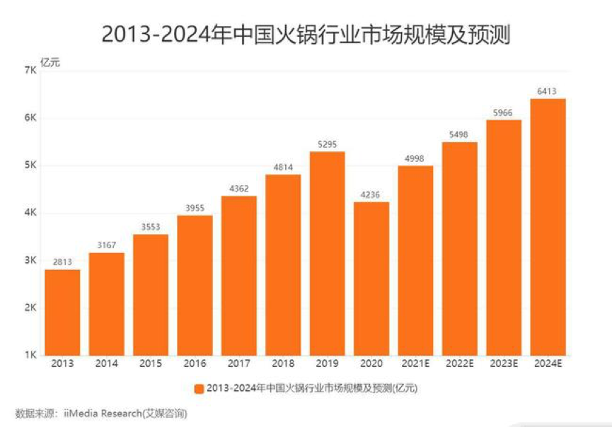 艾媒咨詢數(shù)據(jù)顯示,2020年中國火鍋行業(yè)市場(chǎng)規(guī)模由2019年的5295億元跌至4236億元。理論上來說,線下火鍋業(yè)態(tài)的堂食服務(wù)因?yàn)槭芤咔橛绊懚粘鰜淼氖袌?chǎng)份額,將有很大幾率被火鍋食材超市來填補(bǔ)。