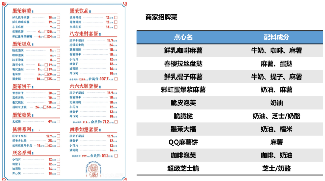 除了主打低糖低脂的全麥類產(chǎn)品依然在線上熱賣之外,線下,以墨茉點心局、瀘溪河等為代表的新中式國潮點心在資本加持之下快速擴張,憑借既新潮又傳統(tǒng)的產(chǎn)品和文化符號,俘獲著不敢吃甜食的年輕人們。而他們能在“一夜之間”成為網(wǎng)紅,除了營銷打法的創(chuàng)新,在產(chǎn)品配料上也下足了功夫。