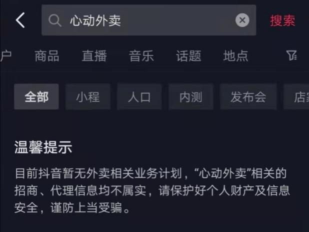 在抖音內(nèi)搜索心動外賣,確實(shí)原來的小程序已經(jīng)下架,且表示目前并無外賣相關(guān)業(yè)務(wù)計(jì)劃。