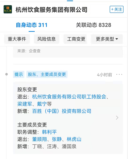 聯(lián)商快訊:12月10日消息,企查查信息顯示,杭州飲食服務(wù)集團有限公司近日發(fā)生工商變更,杭州飲食服務(wù)有限公司職工持股會、梁建軍、戴寧等多名原股東退出,新增股東百勝(中國)投資有限公司。