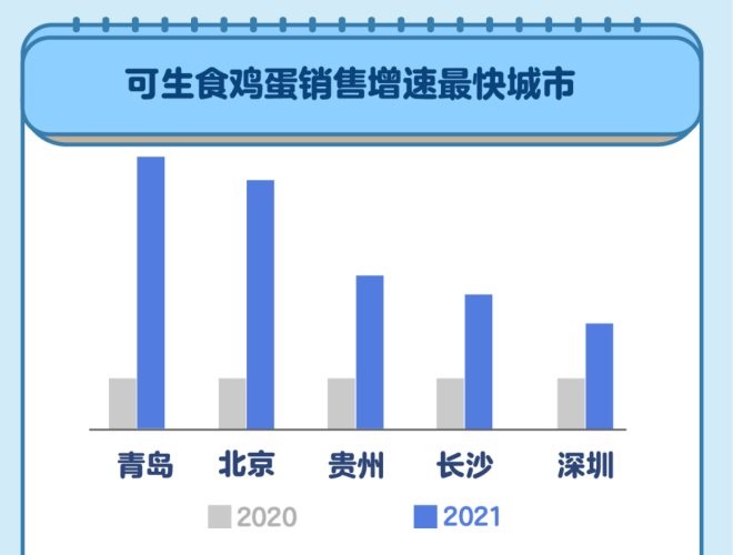 因?yàn)椴缓抽T(mén)氏菌,無(wú)蛋腥味更好吃,可生食雞蛋近年來(lái)風(fēng)靡盒區(qū)房?墒,《報(bào)告》顯示,西安、長(zhǎng)沙的消費(fèi)者還是會(huì)煮到全熟,吃起來(lái)有雙重安全感。
