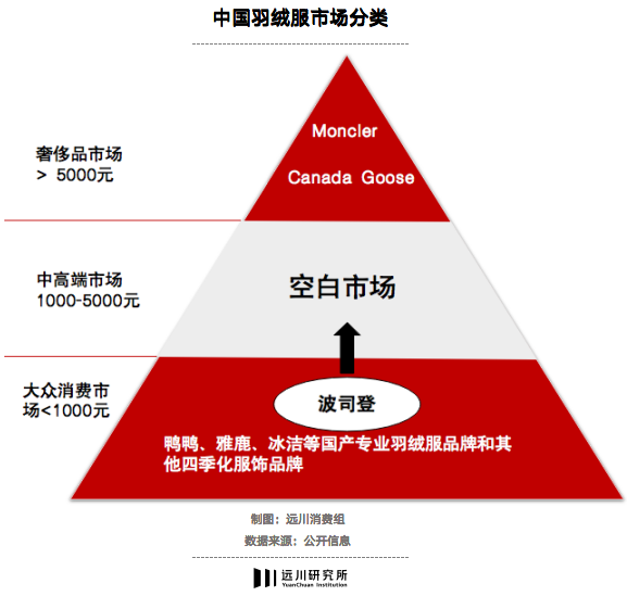 只是,如果將中國羽絨服市場模擬成一座金字塔,波司登僅僅是從“底部”提升到了“腰部”,從“大眾消費市場”,提升到了“中高端市場”,距離“頂部”的奢侈級羽絨服仍然有很大差距。