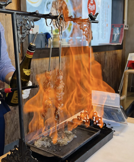 比如,群生大院的驢肉串,呈現(xiàn)形式特別像毛筆架子,上菜之后服務(wù)員會(huì)在顧客面前用白蘭地點(diǎn)火,儀式感和觀賞性都十分強(qiáng)。