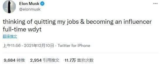 這源于他最新的一則動態(tài)——12月10日晚,馬斯克在社交媒體上表示,“我正在考慮辭去我的工作,全職做一個意見領(lǐng)袖(influencer)。你們覺得呢?”這番言論在全球引發(fā)熱議,甚至有網(wǎng)友調(diào)侃:地球已經(jīng)容不下他了?