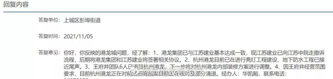 2020年3月之前,在浙江政務(wù)網(wǎng)上,江干區(qū)彭埠街道在問政回復(fù)中亦表示,港龍城與第三方合作方已達(dá)成合作意向,下一步裝修隊(duì)將進(jìn)場。