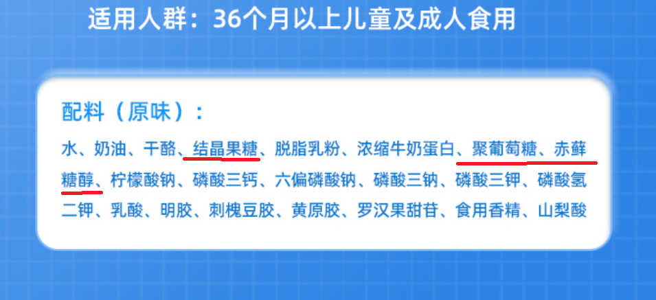 更有商家對(duì)兒童吃的食物也不放過(guò)。妙飛的0糖奶酪在宣傳上一直說(shuō)自己是“0蔗糖”,但翻翻成分表就可以發(fā)現(xiàn),奶酪里還有含有結(jié)晶果糖、聚葡萄糖、赤蘚糖醇等各種成分。