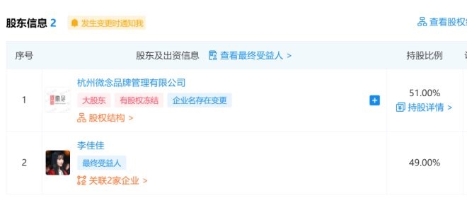 今年11月,微念持有李子柒公司股權(quán)被凍結(jié),持股51%。