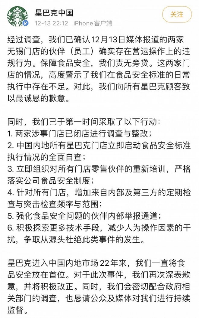 12月13日深夜,星巴克中國再度發(fā)布聲明表示,“經(jīng)過調(diào)查,我們已確認(rèn)12月13日媒體報(bào)道的兩家無錫門店的伙伴(員工)確實(shí)存在營運(yùn)操作上的違規(guī)行為。保障食品安全,我們責(zé)無旁貸。這兩家門店的情況,高度警示了我們?cè)谑称钒踩珮?biāo)準(zhǔn)的日常執(zhí)行中存在不足。對(duì)此,我們向所有星巴克顧客致以最誠懇的歉意!