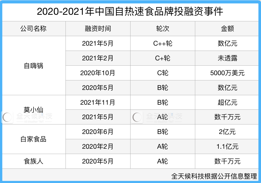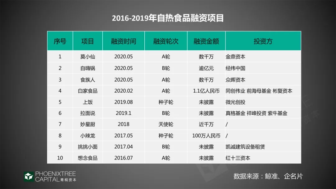 據(jù)青桐資本不完全統(tǒng)計(jì),2016年-2019年,自熱食品賽道融資項(xiàng)目僅6個(gè),公開披露的融資額單筆最高也是近千萬元;而在2020年前五個(gè)月,行業(yè)內(nèi)就有4家企業(yè)獲得了融資,單筆融資少則數(shù)千萬元、多則逾億元。