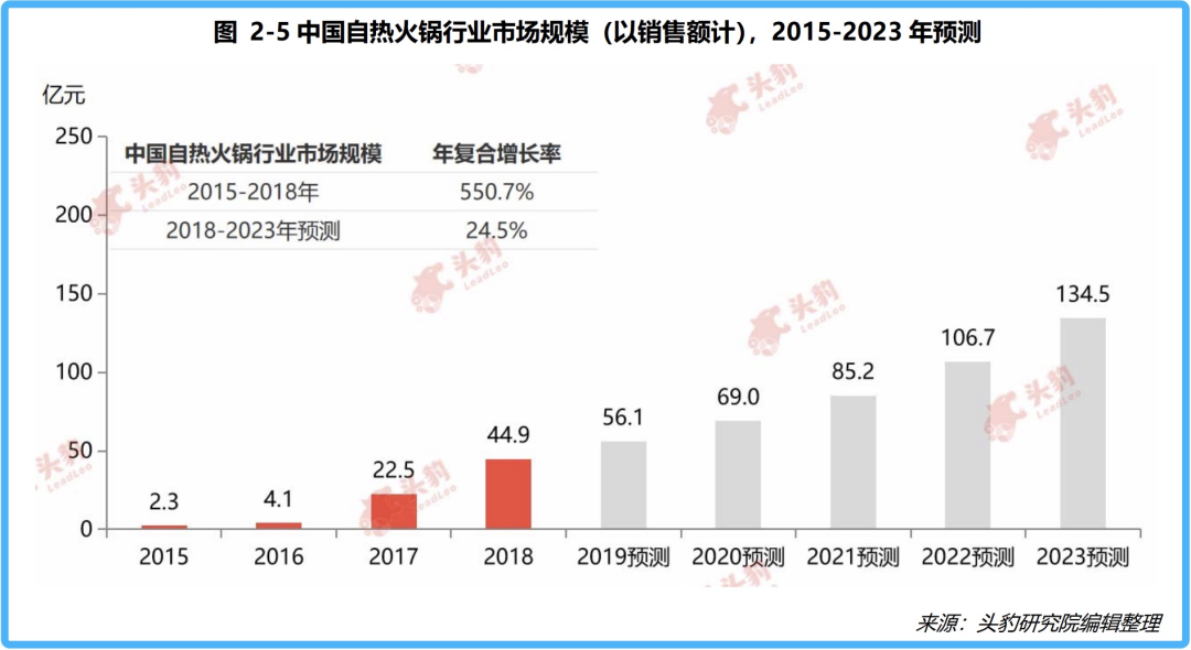頭豹研究院發(fā)布的報(bào)告顯示,2015-2018年,中國自熱火鍋行業(yè)市場(chǎng)規(guī)模由2.3億元增長至44.9億元,年復(fù)合增長率高達(dá)550.7%,現(xiàn)階段線上電商平臺(tái)銷售自熱火鍋的店鋪數(shù)量已超300家;預(yù)計(jì)到2023年,中國自熱火鍋行業(yè)市場(chǎng)規(guī)模將達(dá)到134.5億元。