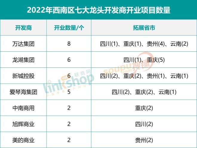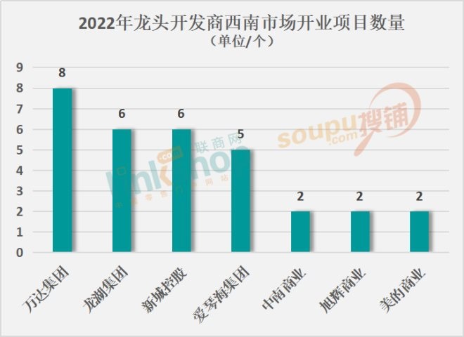 對2022年西南區(qū)七大龍頭開發(fā)商開業(yè)項目數(shù)量進行統(tǒng)計可以看到,萬達一騎絕塵,以8座新萬達廣場的開業(yè)量問鼎2022年西南市場新項目數(shù)量之最。其次是龍湖集團和新城控股,明年均將在西南開出6座全新商業(yè)體。愛琴海集團次之,明年將在西南貢獻5個新項目。此外,中南商用、美的商業(yè)、旭輝商業(yè)也分別至少有2座新項目入市。