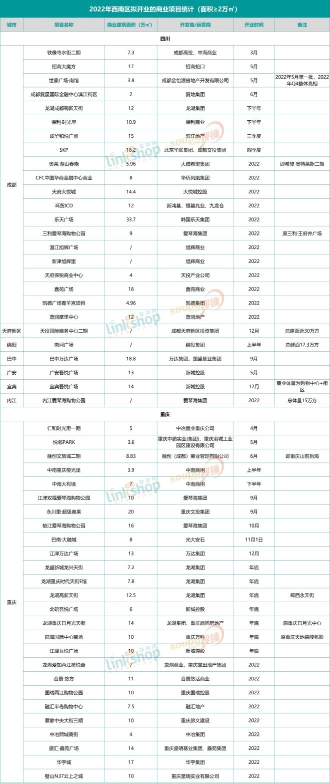 附2022年西南區(qū)域擬開業(yè)商業(yè)項目統(tǒng)計: