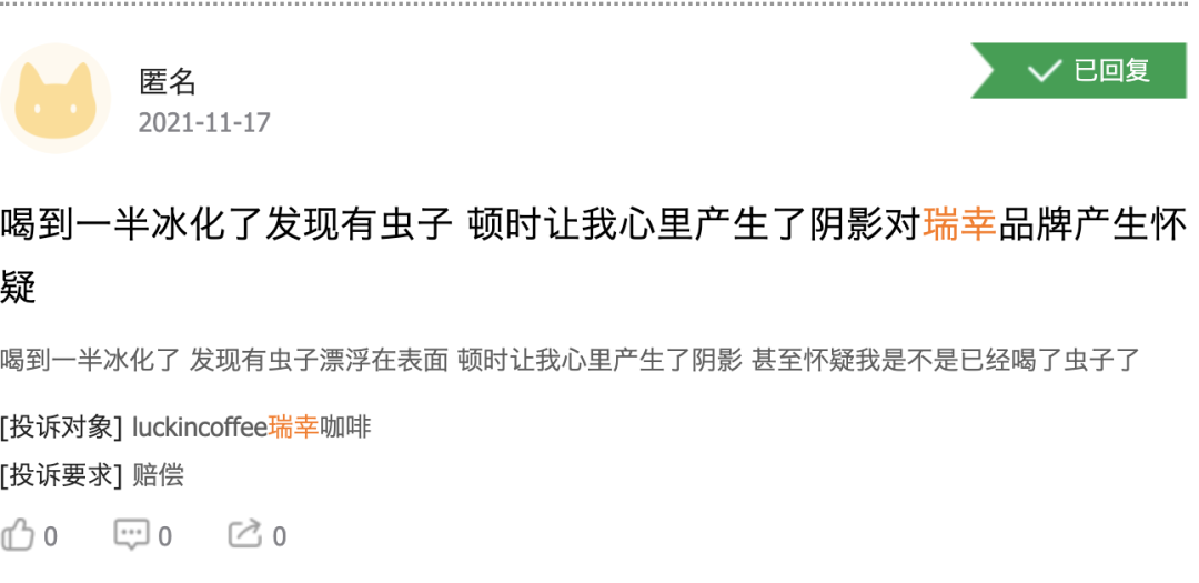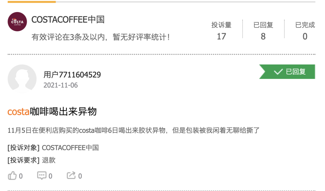 但對(duì)比多家咖啡品牌的投訴帖之后,我們發(fā)現(xiàn),其他咖啡品牌中也有類似問題,比如瑞幸咖啡的投訴量達(dá)到了2465,CostaCoffee中國的投訴量17,也有消費(fèi)者表示在這兩家咖啡品牌中喝出蟲子的問題。足以見得,食品安全問題其實(shí)是咖啡行業(yè)的通病。