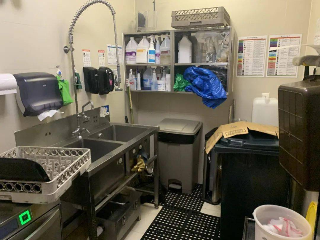 所有機(jī)器和設(shè)備都要再清洗一遍,紅、綠、藍(lán)不同顏色的抹布對(duì)應(yīng)不同的區(qū)域;連吧臺(tái)的地墊都是要清潔的,很多員工甚至?xí)蛟诘厣先ゲ恋亍?/p>