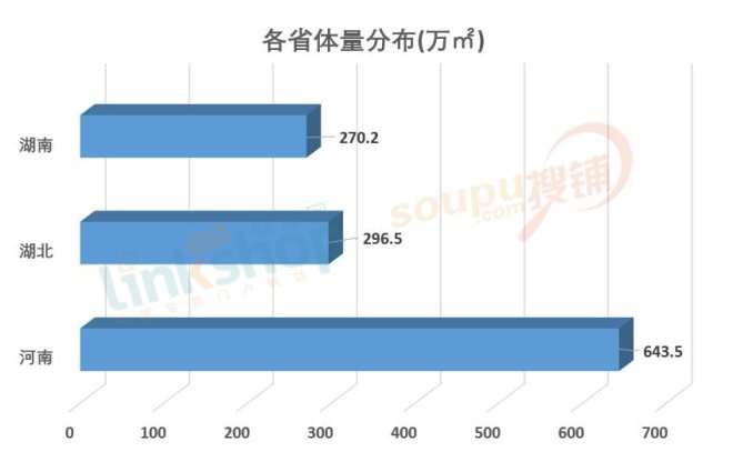 在商業(yè)體量方面,數(shù)量第一的河南,自然也以643.5萬㎡成為總體量第一,湖南以296.5萬㎡緊隨其后,湖北以270.2萬㎡位列第三。