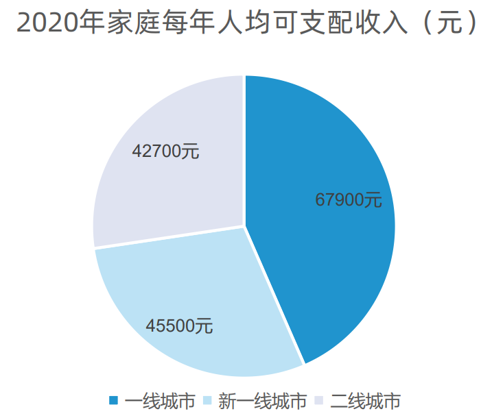 2020年中國(guó)一線城市、新一線城市和二線城市的家庭每年人均可支配收入分別為67900元、45500元及42700元?芍涫杖氲脑黾訛榫用耧嬍成(jí)提供經(jīng)濟(jì)基礎(chǔ)。