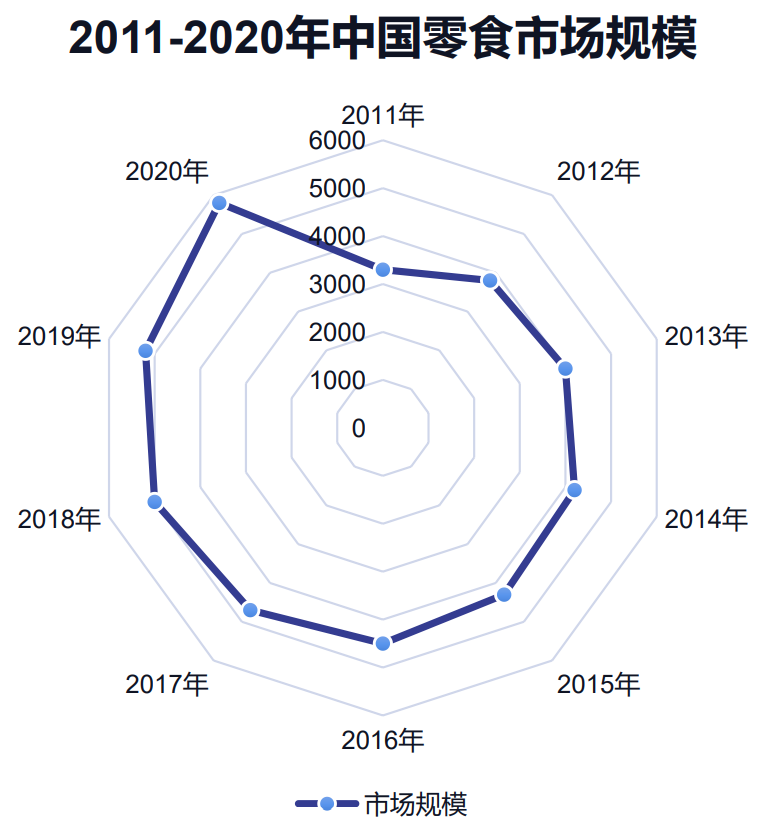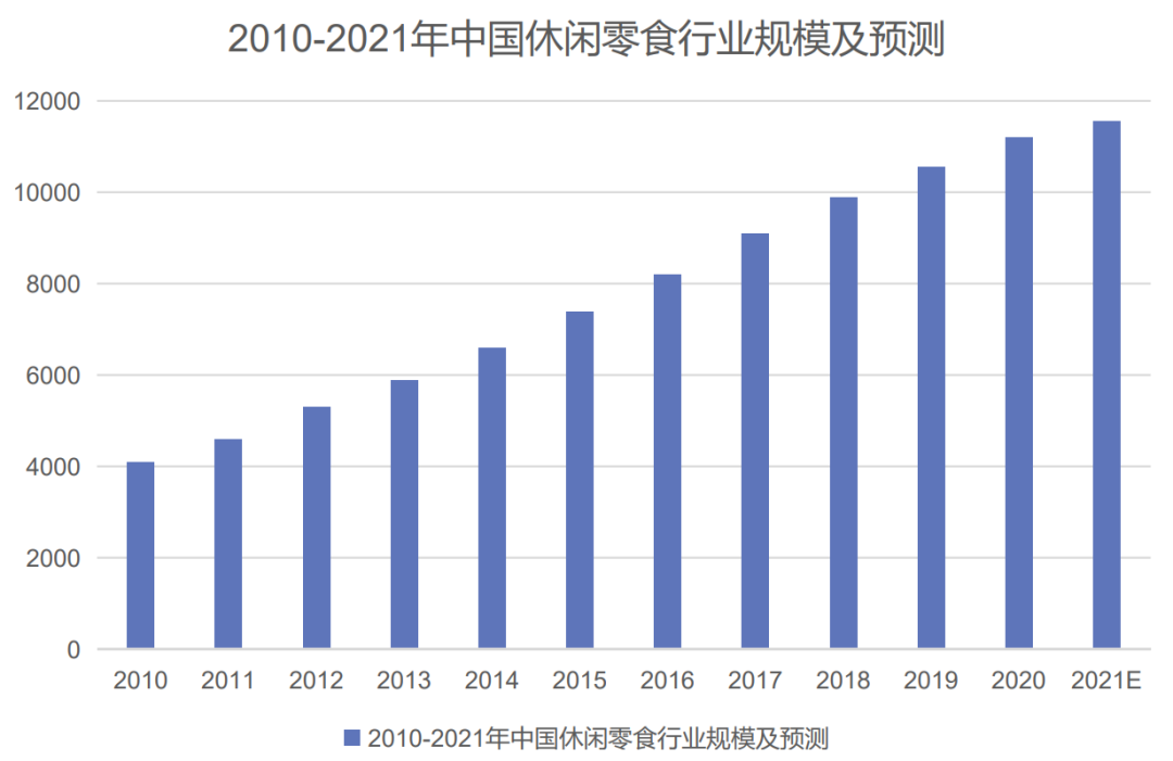 在零食行業(yè),市場(chǎng)發(fā)展迅猛,行業(yè)總產(chǎn)值規(guī)模呈快速上升趨勢(shì)。自2006年起,10年間增長(zhǎng)幅度達(dá)422.51%,年復(fù)合增長(zhǎng)率為17.98%。2020年我國(guó)休閑零食行業(yè)規(guī)模已達(dá)11200億元,預(yù)計(jì)2021年行業(yè)規(guī)模將達(dá)11562億元。零食產(chǎn)品豐富多元,主要品類包括堅(jiān)果炒貨類、話梅類、果脯果干類、肉類等。目前,淘寶對(duì)零食的分類口徑超過(guò)100余個(gè)。