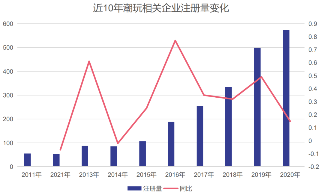 在潮玩行業(yè),潮玩已經(jīng)成為現(xiàn)代年輕人潮流消費(fèi)與社交的重要組成部分。數(shù)據(jù)顯示,2020年中國(guó)潮玩經(jīng)濟(jì)市場(chǎng)規(guī)模達(dá)到294.8億元,預(yù)計(jì)2021年將以30.4%的增速升至384.3億元。全國(guó)范圍內(nèi)共現(xiàn)存超491萬(wàn)家玩具相關(guān)企業(yè),潮玩相關(guān)企業(yè)超3千家。伴隨用戶消費(fèi)暴漲和資本加持,潮玩品牌在近年來(lái)頻頻出圈。
