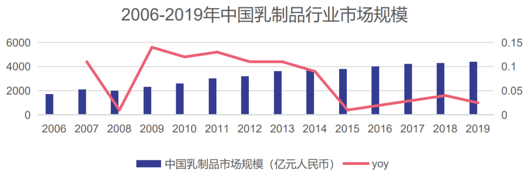 在乳品行業(yè),2019年,中國(guó)乳制品市場(chǎng)規(guī)模達(dá)4284億人民幣(折合619億美元),僅次于美國(guó)的677億美元,位列全球第二。當(dāng)下,中國(guó)乳制品市場(chǎng)已由滲透率快速提升階段過(guò)渡至目前的價(jià)增驅(qū)動(dòng)階段。滲透率高位水平下,量增速度放緩,價(jià)增推動(dòng)行業(yè)整體規(guī)模增長(zhǎng),高端常溫奶、酸奶成為消費(fèi)升級(jí)下的行業(yè)新寵。