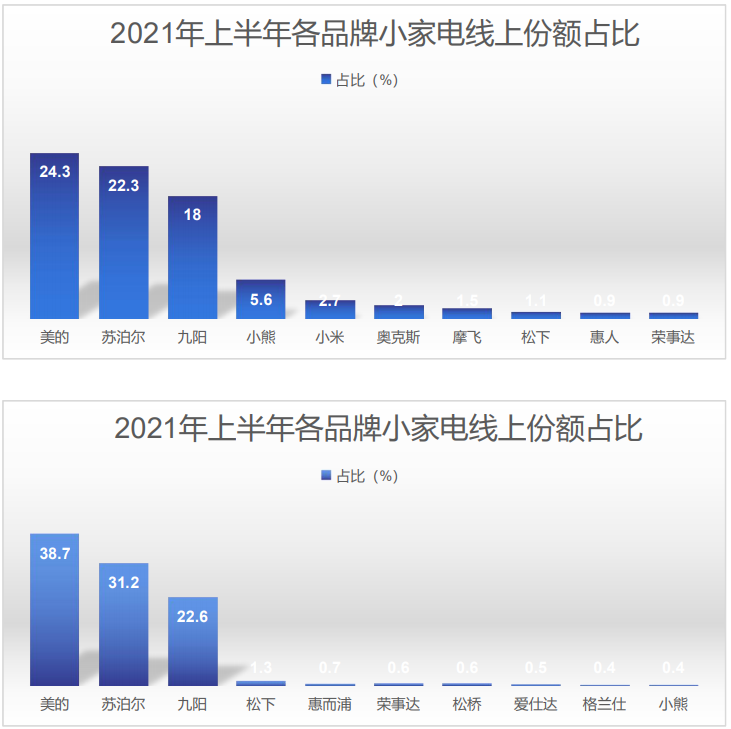 在小家電行業(yè),隨著消費(fèi)升級(jí),滿足便捷、功能、性價(jià)比、顏值、健康生活、智能等多元素疊加的創(chuàng)新小家電陸續(xù)推出。2021上半年小家電零售額共計(jì)250.8億元,同比下降8.6%;零售量11911萬(wàn)臺(tái),同比下降8.2%。小家電頭部品牌集中發(fā)力線上市場(chǎng),集中度有所提升,尾部品牌受到多方承壓。