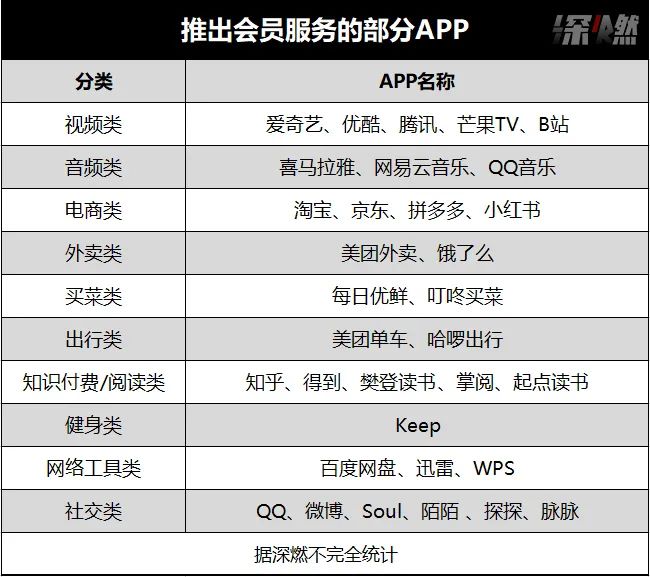 一方面,大家開通的APP會(huì)員數(shù)量不斷上升。據(jù)深燃統(tǒng)計(jì),目前大眾在日常生活中能用到的會(huì)員,至少有33個(gè)。