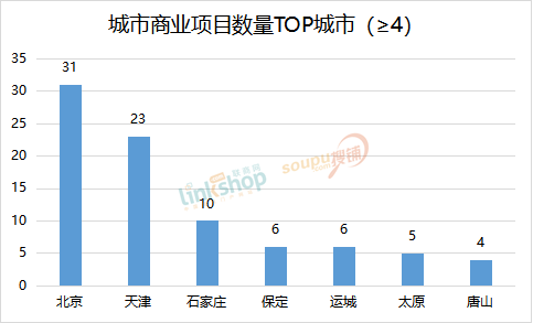 從華北各城市新增商業(yè)項目數(shù)量來看,新增4家及以上擬開業(yè)的城市有北京、天津、石家莊、保定、運城、太原和唐山。其中,作為省會城市,石家莊擬新開業(yè)項目達10家,太原擬新開業(yè)項目僅有5家。上榜城市多為直轄市、省會城市或省域副中心城市。