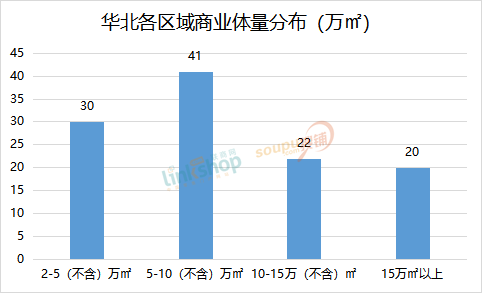 聯(lián)商網(wǎng)零售研究中心數(shù)據(jù)顯示,從華北地區(qū)商業(yè)項目體量分布及占比情況,5-10萬方項目占居主流,數(shù)量達到41個,占比為36.28%。緊隨其后的是2-5萬方的小商業(yè)綜合體,這些商業(yè)體以本土開發(fā)商為主,項目數(shù)量為30個,占比為26.55%。