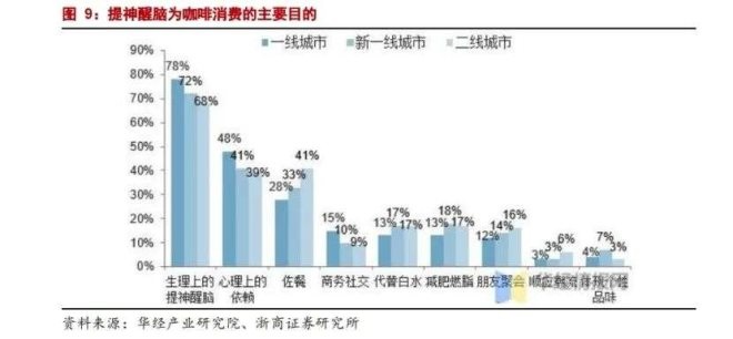 自取模式的目標(biāo)客群非常龐大,高于第三空間模式。第三空間并非咖啡消費(fèi)者的剛需。根據(jù)華經(jīng)產(chǎn)業(yè)研究院數(shù)據(jù),商務(wù)社交等需第三空間的咖啡消費(fèi)目的目前僅排名第四,提神醒腦的功能性消費(fèi)才是目前最重要的咖啡消費(fèi)目的。