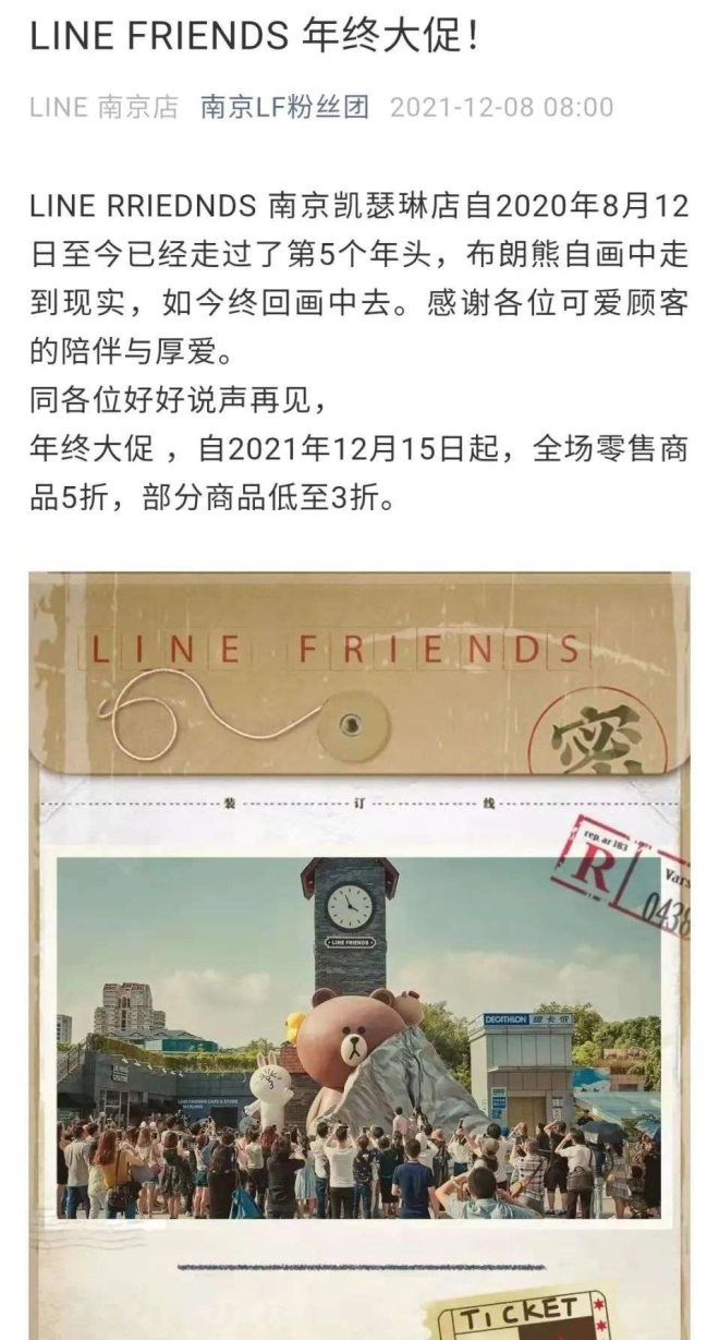12月8日,LINE FRIENDS南京店官方微信號“南京LF粉絲團(tuán)”宣布“即將停業(yè)”的消息,在“同各位好好說再見”的同時,開啟年終大促。