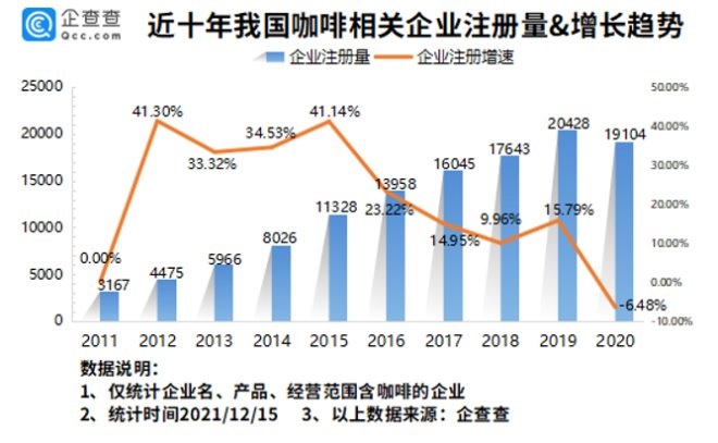 聯(lián)商快訊:企查查數(shù)據(jù)顯示,2021年前11月,我國新增咖啡相關(guān)企業(yè)2.23萬家,同比增長31.28%。