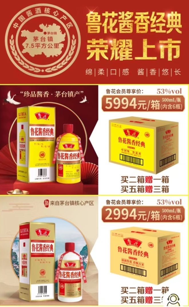 有消費(fèi)者發(fā)現(xiàn),魯花微信會(huì)員商城近日推出了兩款醬香白酒產(chǎn)品,其中魯花醬香經(jīng)典(黃)售價(jià)為每瓶999元,魯花醬香經(jīng)典(白)售價(jià)為每瓶499元。在商城上,這兩款產(chǎn)品僅支持按箱售賣(mài),均實(shí)行買(mǎi)2箱送1箱、買(mǎi)5箱送3箱的優(yōu)惠政策。按照優(yōu)惠后的價(jià)格來(lái)算,兩款醬酒的價(jià)格分別為660元和330元左右,定位在次高端市場(chǎng)。
