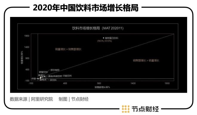 另據(jù)天貓新品創(chuàng)新中心發(fā)布的《2020植物蛋白飲料創(chuàng)新趨勢》,2020年植物蛋白飲料行業(yè)迎來爆發(fā),銷售額增長率達(dá)到965%,銷量增長率達(dá)到1810%,購買人數(shù)增長9倍,遠(yuǎn)超其他飲料品類。