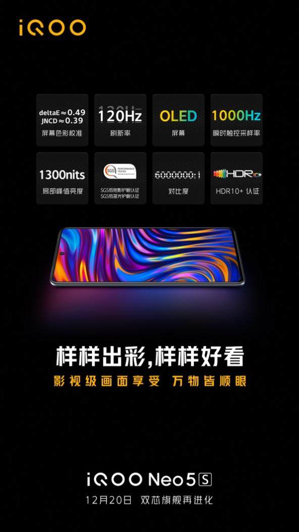 除了外觀的高顏值外,iQOO官方還公布了Neo5S的視覺效果好“屏”。iQOO Neo5S采用了一塊OLED直屏,支持120Hz高刷新率,以及最高1000Hz的瞬時(shí)觸控采樣率,局部峰值亮度可達(dá)1300尼特,對(duì)比度也高達(dá)6000000:1,還支持HDR10+以及SGS兩項(xiàng)標(biāo)準(zhǔn)認(rèn)證,帶來影視級(jí)的視覺效果。